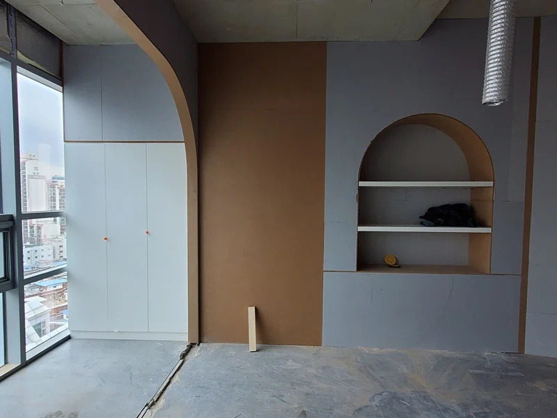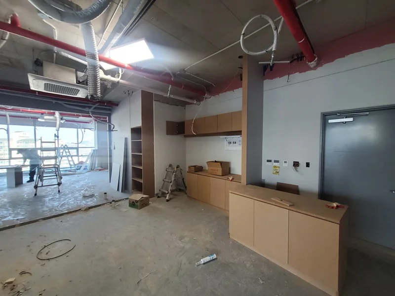 회의실은 유리 파티션을 설치해 개방감을 유지하면서도 독립성을 확보했습니다. 마지막으로 먼지와 자재 잔여물을 모두 정리한 뒤, 디테일을 점검하고 마무리 공사를 진행했습니다.