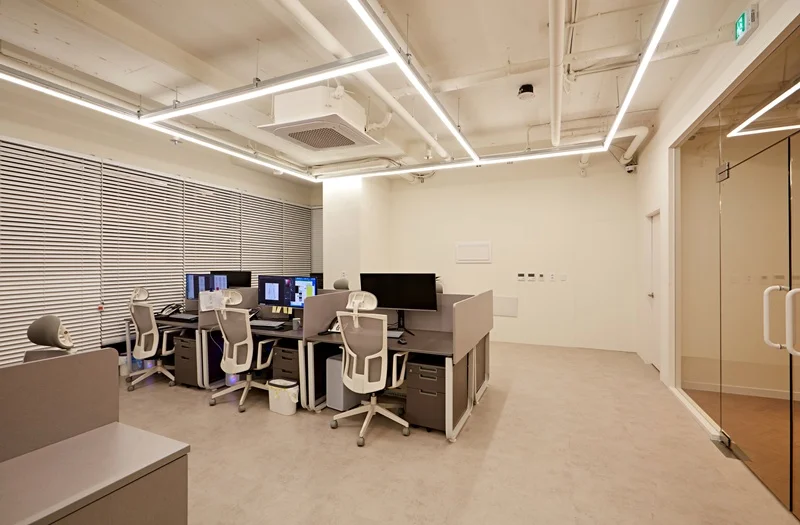 안쪽으로 들어가면 본격적인 업무 공간이 펼쳐집니다. 유리 파티션으로 휴게공간과 시각적으로 구분되면서도, 완전히 닫히지 않아 개방감을 유지합니다. 책상과 의자는 군더더기 없이 깔끔하게 배치되었으며, 화이트와 그레이 톤으로 맞춰져 집중력을 높이는 효과를 줍니다.