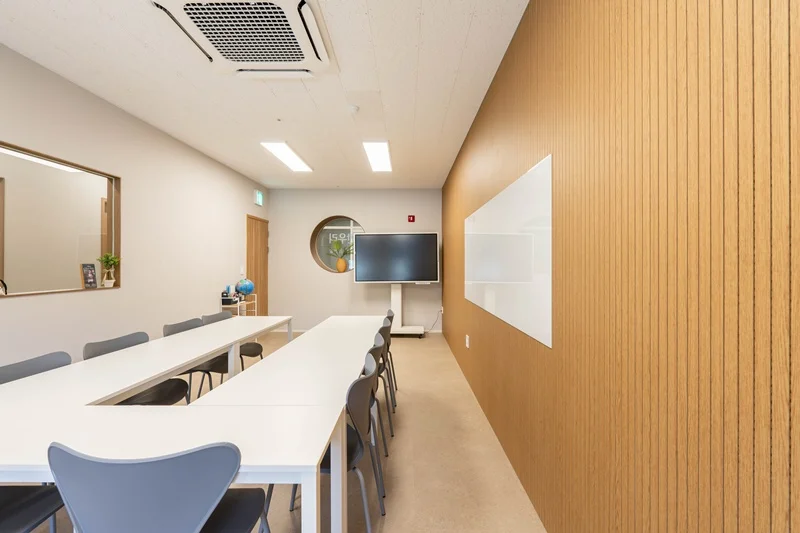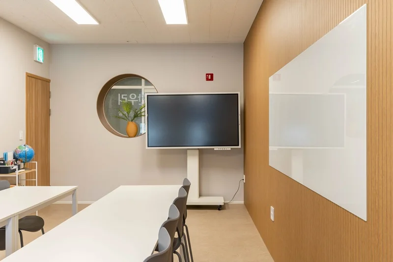 강의실 내부는 ㄷ자 형태의 책상 구조로 배치되어 있어, 학생들이 서로 얼굴을 맞대고 토론과 그룹 학습을 진행할 수 있습니다. 이는 독서논술 학원의 학습 목표와 정확히 맞닿아 있으며, 단순히 지식을 전달하는 공간이 아니라 학생들이 생각을 나누고 의견을 표현할 수 있는 학습 환경을 조성합니다.