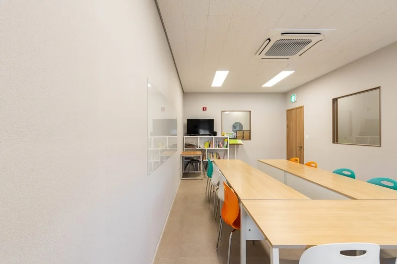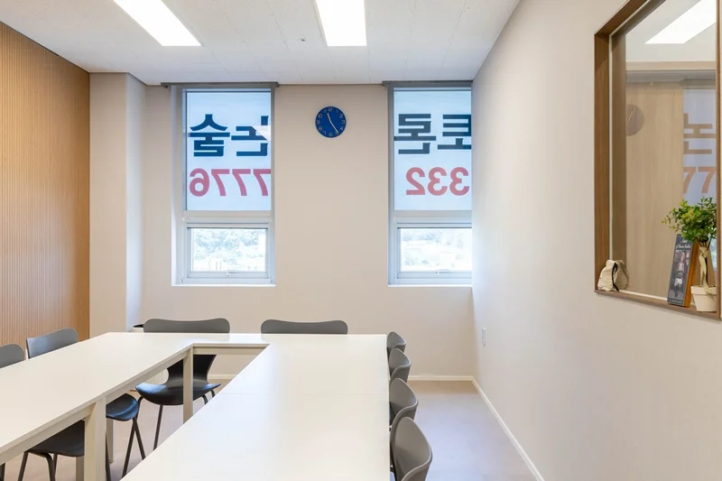 강의실 공간은 프랜차이즈 학원의 특성을 고려하여 실용성과 시각적 개방감을 동시에 확보했습니다. 각 강의실은 유리 창문으로 구성되어 내부가 외부에서 확인 가능하며, 동시에 내부에서도 외부와 소통할 수 있는 구조입니다. 이 유리 창문은 단순히 시각적 개방감만 제공하는 것이 아니라, 학원 운영자 입장에서는 학생들의 학습 상황을 간편하게 확인할 수 있는 장점도 있습니다.