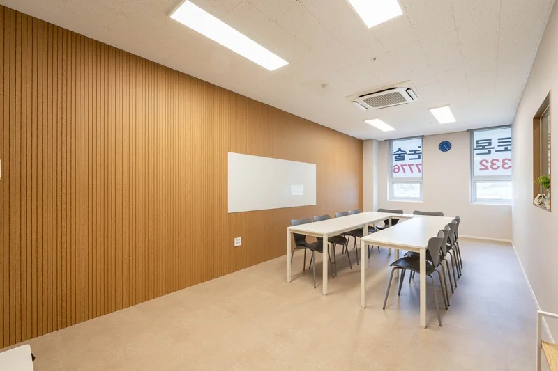또한 각 강의실 벽면에는 화이트보드를 설치하여, 강사와 학생 간의 실시간 토론과 학습 피드백이 가능하도록 구성했습니다. 화이트보드와 ㄷ자형 책상 구조의 조합은 소규모 학원에서 공간 활용을 극대화하면서도 학습 효율을 높이는 설계 포인트입니다.