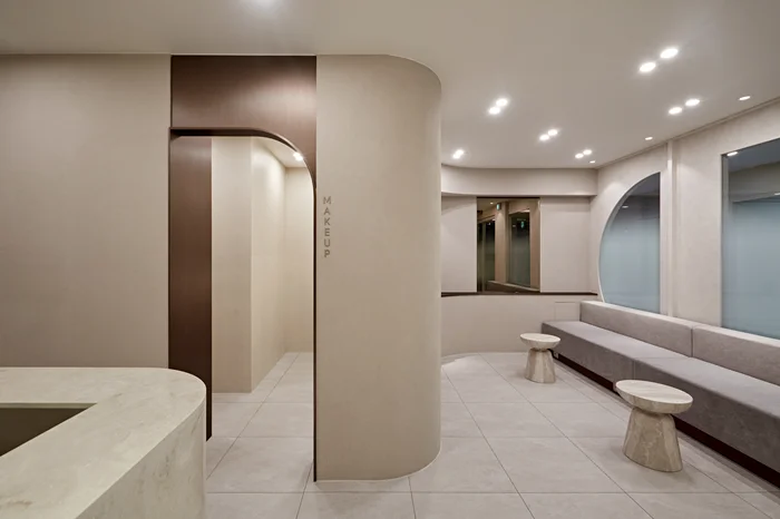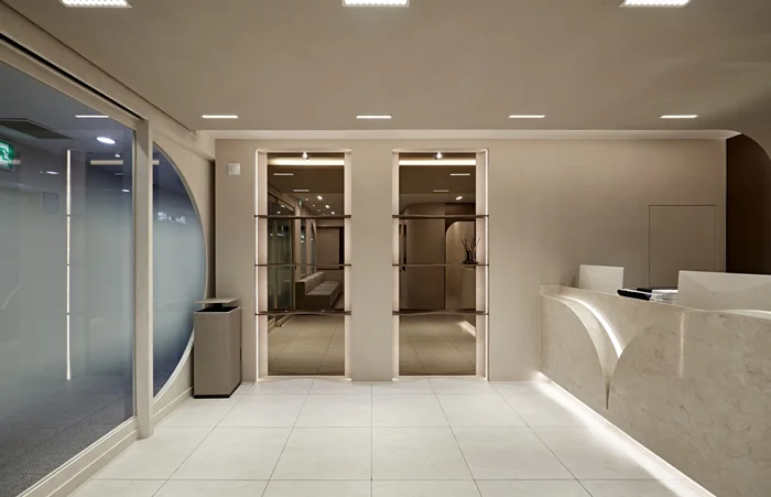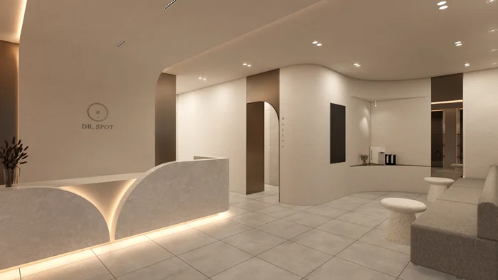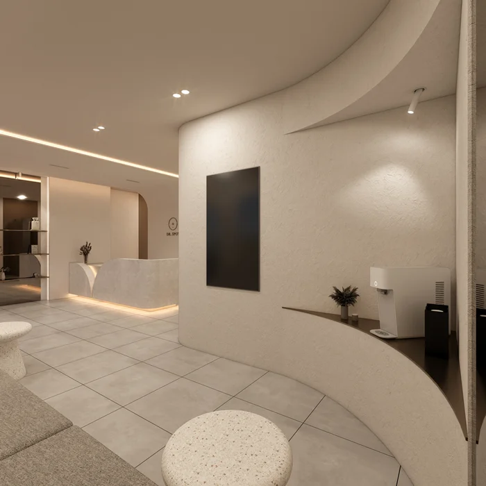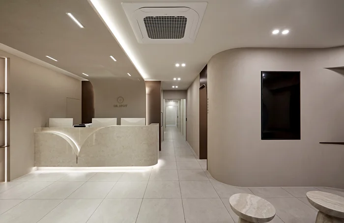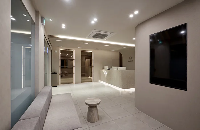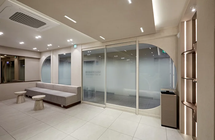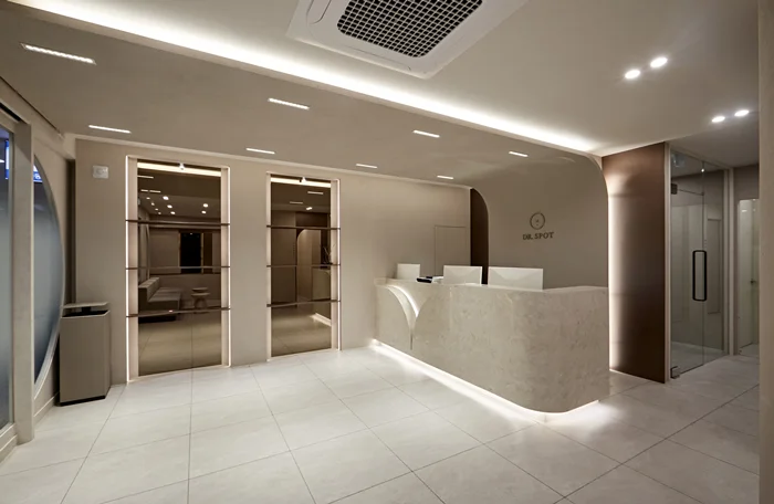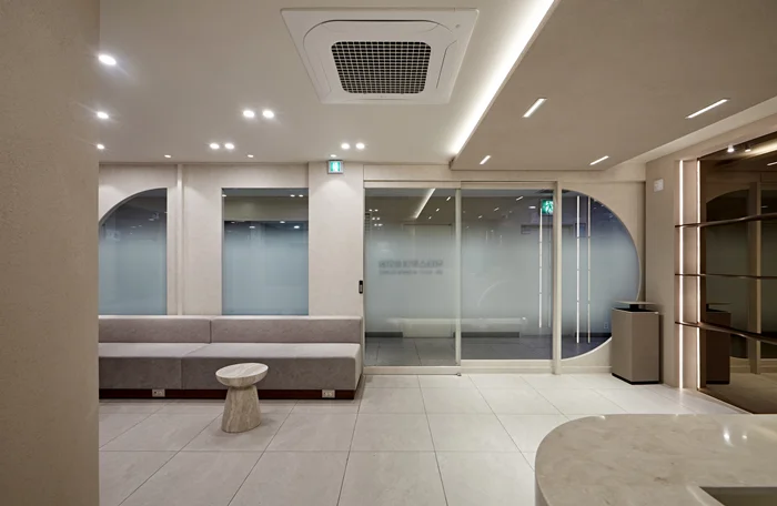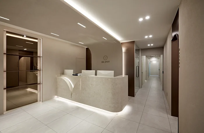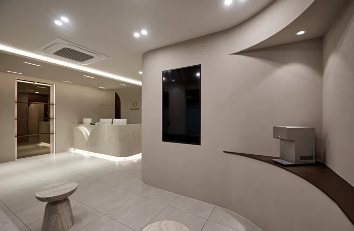 로비에 들어서면 가장 먼저 눈에 띄는 것은 곡선형 벽체 디자인내추럴 베이지 컬러의 벽면이에요. 딱딱한 직선 위주의 기존 병원과는 달리, 부드러운 곡선을 적극적으로 활용해 고객의 긴장을 풀어주는 분위기를 연출했습니다.