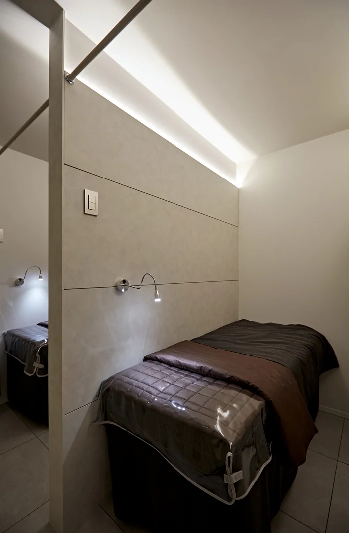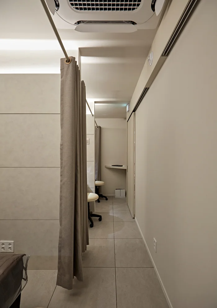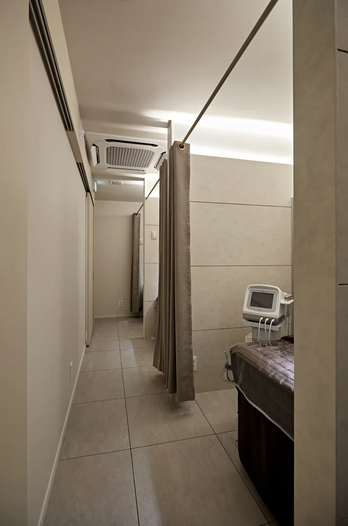 한방 치료가 이루어지는 치료실개별 베드 공간마다 커튼 가림막을 설치해 프라이버시를 철저히 지키면서도 개방감을 유지할 수 있도록 구성했습니다. 치료실의 컬러톤은 베이지+크림 컬러 조합으로 편안하고 위생적인 이미지를 강조했으며, 바닥 마감 역시 논슬립 타일을 사용하여 안전성을 확보했습니다.