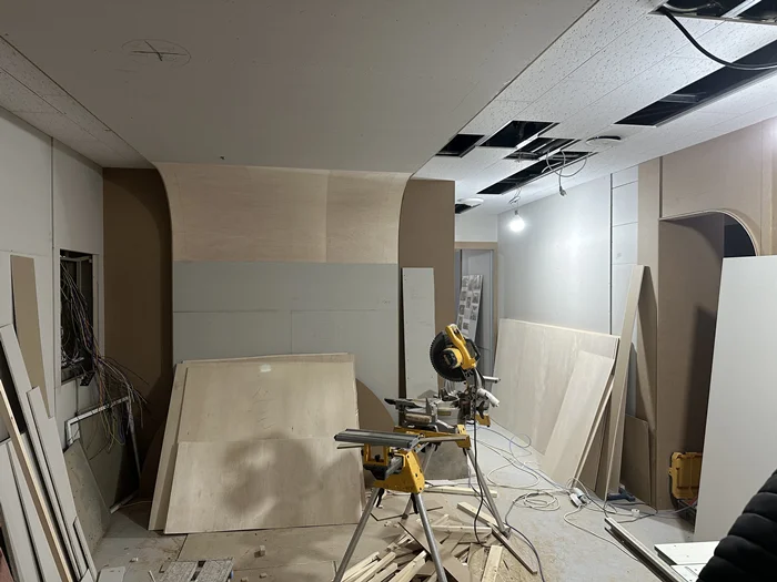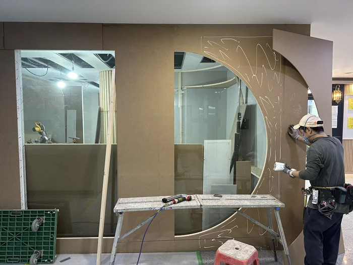 3D 디자인 설계에서 제안했던 곡선형 벽체와 아치형 구조물을 목공 작업으로 구현했습니다.
