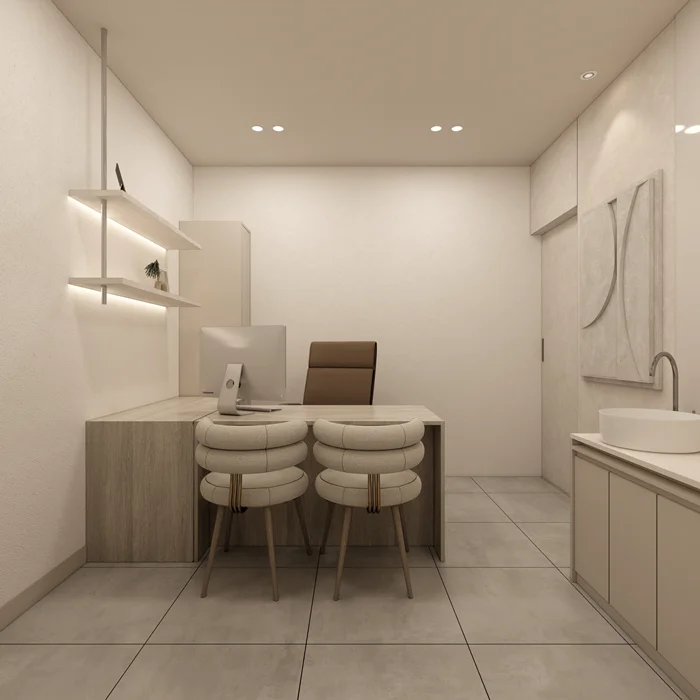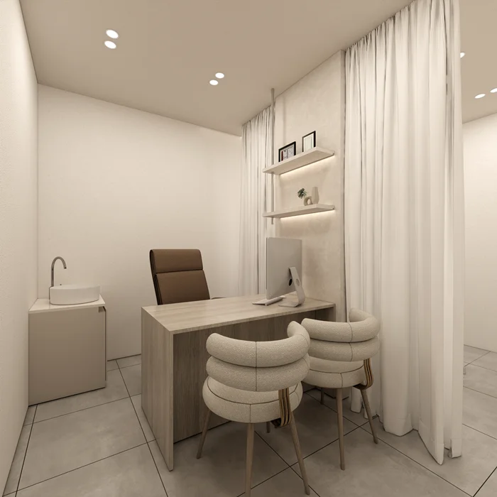 진료실은 공간을 부드러운 색상으로 통일감 있게 구성하였습니다. 벽체 마감은 부드러운 패브릭 텍스처의 친환경 도장 마감을 적용하여 자연스러움과 따뜻함을 강조했고, 진료용 테이블과 의자 역시 우드와 아이보리 컬러 조합으로 차분한 분위기를 완성했습니다.