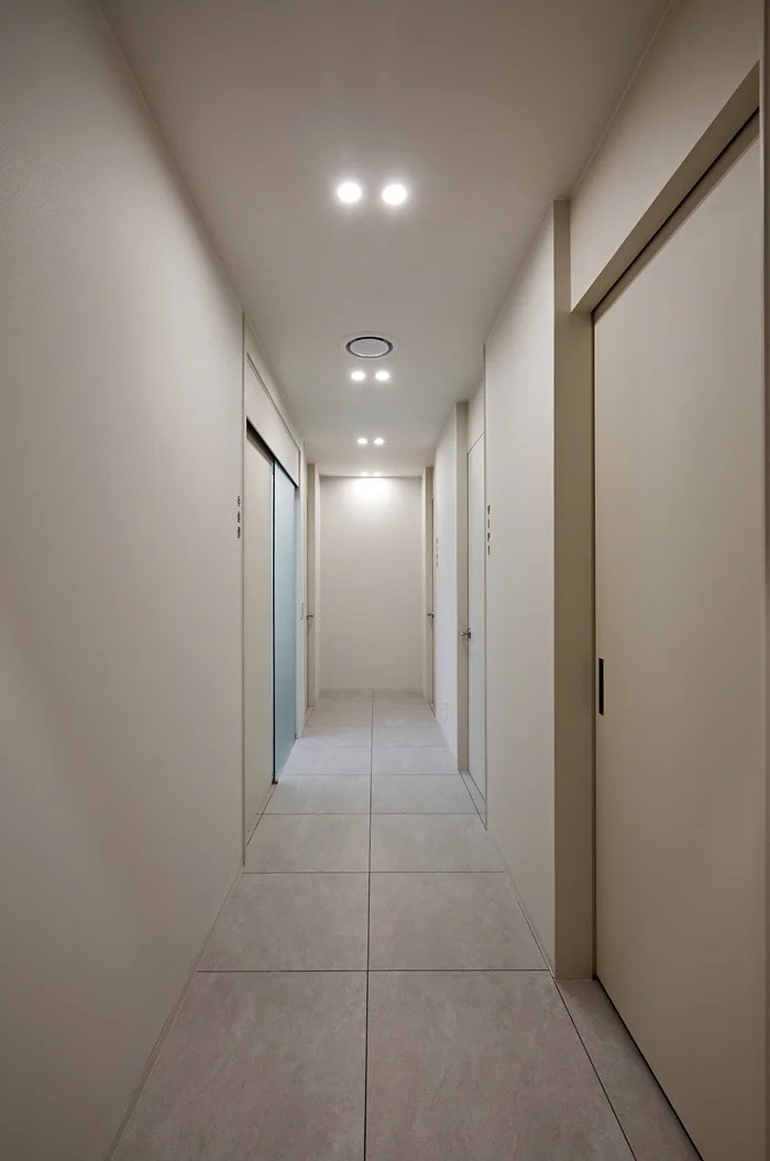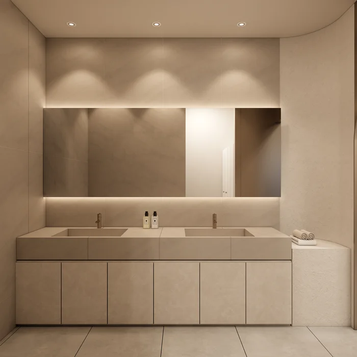 바닥은 연베이지 톤의 타일 마감으로 깔끔함과 위생적인 이미지를 강조하고, 천장은 간접 매입 조명LED 다운라이트로 포인트를 주어, 어둡거나 칙칙한 느낌 없이 공간 전체가 밝고 따스하게 느껴지도록 했습니다.