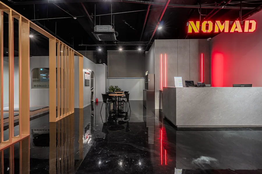 벽 쪽에 설치된 전면 화이트 전광판은 붉은 컬러의 로고를 돋보이게 하여 매력적인 인상을 주죠.