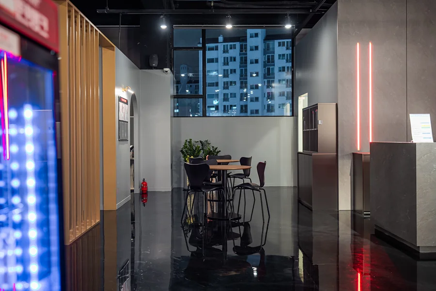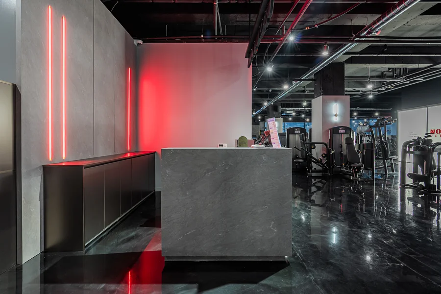 이 헬스장에서는 안내 데스크 위쪽에 LED 네온사인으로 상호를 강조하며, 고객들이 쉽게 알아볼 수 있도록 하였습니다. 또한, 데스크 뒤편에는 라인 조명을 활용해 아늑한 분위기를 연출했습니다.