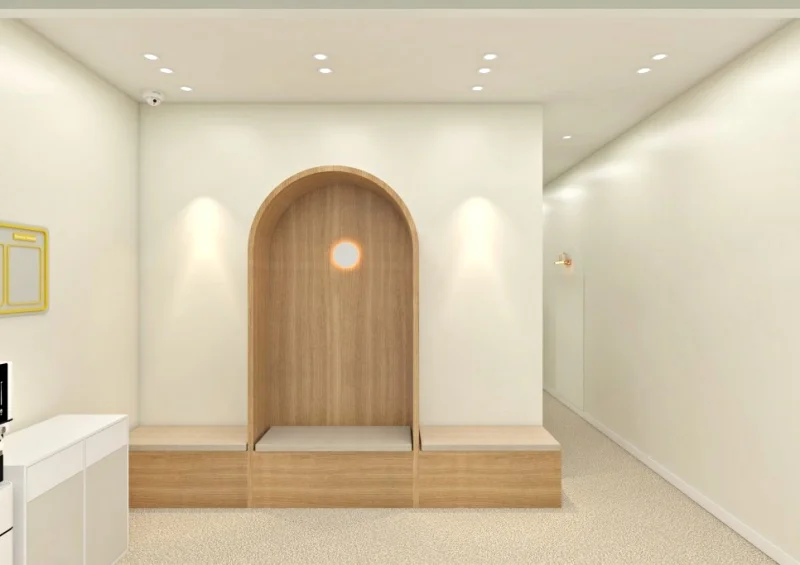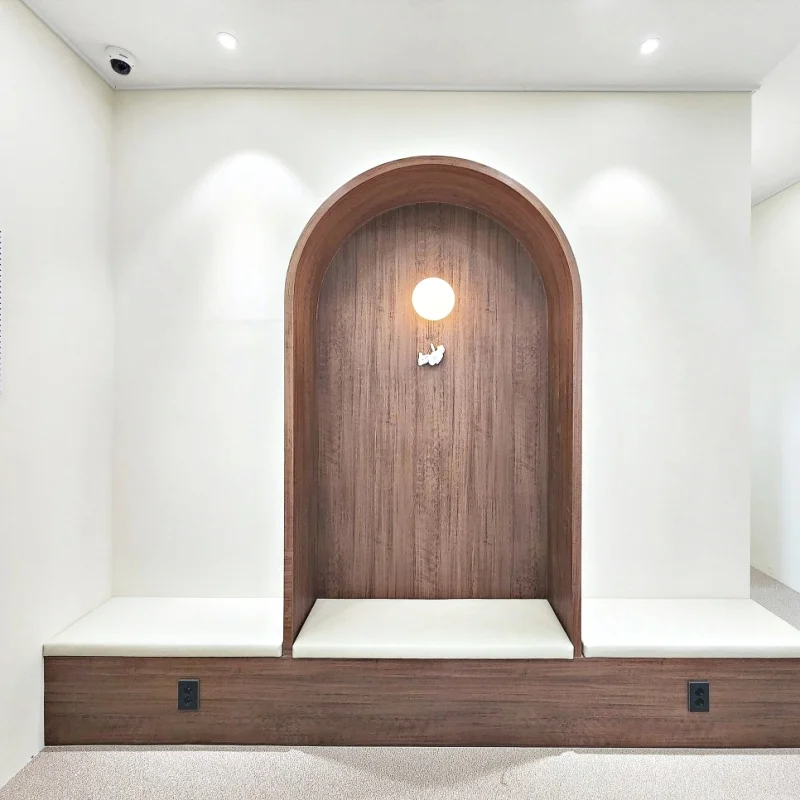 곡선형 아치 벤치는 우드 텍스처를 활용하여 따뜻하고 차분한 분위기를 주며, 안쪽에 조명을 설치해 아늑한 분위기를 연출했습니다. 이 공간은 학생들이 수업 전후 기다리는 공간으로 활용되며, 작은 공간이지만 단조롭지 않고 디자인적 완성도가 높아 방문객에게 좋은 인상을 남길 수 있도록 설계했습니다.