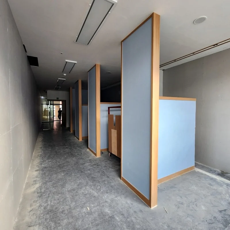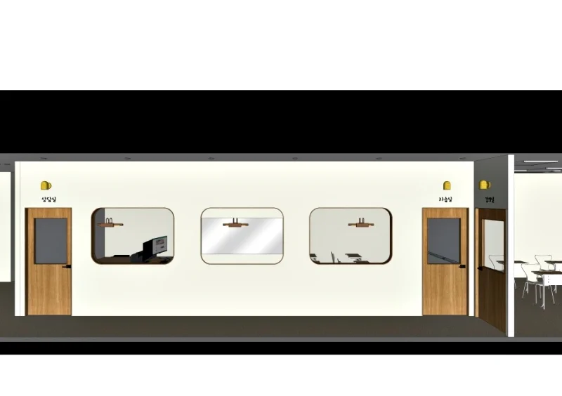 화이트 톤의 벽면과 따뜻한 우드 톤의 몰딩을 포인트로 활용하여 답답하지 않으면서도 단정한 분위기를 유지할 수 있도록 했습니다. 복도 천장에는 매립형 LED 조명을 일정 간격으로 설치해 밝고 균일한 조도 환경을 조성, 학생들의 이동 시 안전성과 쾌적함을 확보하였습니다. 복도 좌우로는 강의실과 상담실, 탕비공간이 배치되어 동선이 자연스럽게 이어지며, 각 공간별 문은 동일한 우드디자인과 실버 손잡이 포인트로 통일감을 줘 작은 학원이지만 정돈되고 세련된 인상을 전달할 수 있도록 구성했습니다.