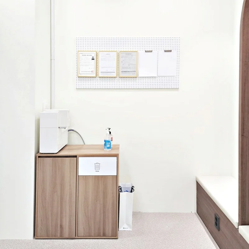 로비 한쪽 코너에 분리수거함과 정수기, 수납함을 함께 배치하여 학생과 강사 모두 편리하게 사용할 수 있도록 했으며, 쓰레기통과 전용 소모품함까지 알맞게 배치해 정돈된 분위기를 유지할 수 있도록 구성했습니다.