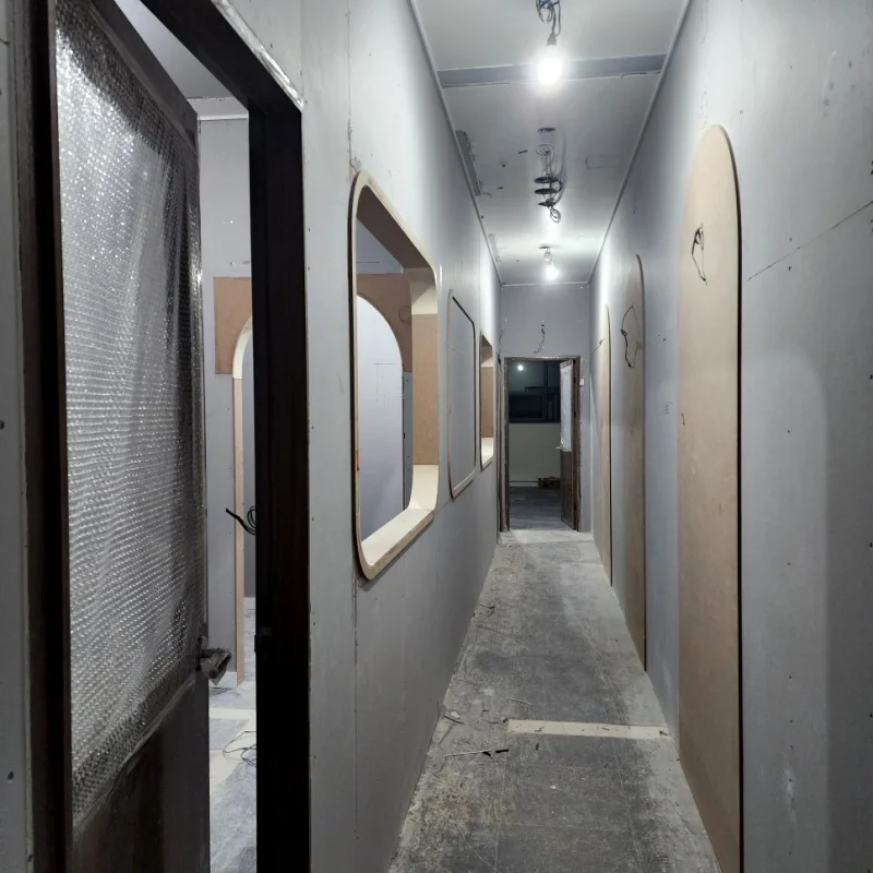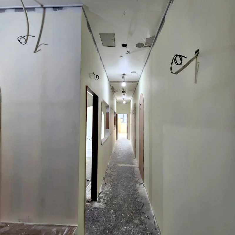 기존 시설물에는 오래된 목공 마감재, 타공 천장, 노후된 도어, 바닥 장판 등이 포함되어 있었고, 이를 모두 철거하고, 천장 몰딩, 벽체, 바닥재를 제거하는 작업부터 진행했습니다.