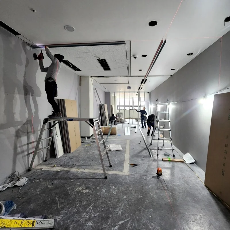 벽체 작업과 동시에 전기배선 공사가 진행되었습니다. 조명, 콘센트, 스위치, 빔 프로젝터, CCTV, 에어컨 배선까지 사전에 설계한 도면을 바탕으로 전기설비 배관 매립 작업을 진행했습니다.