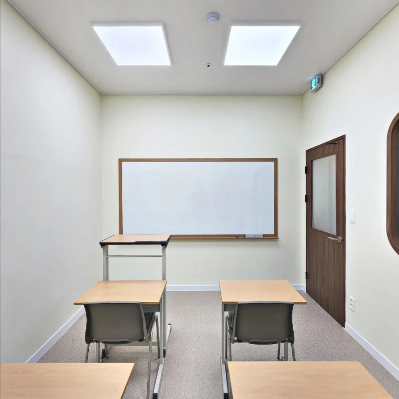 벽면은 화이트색상으로 마감해 깔끔하면서도 눈의 피로를 줄여주는 효과를 주었으며, 전면에는 화이트보드를 설치하여 강의의 다양성과 효율성을 확보했습니다. 각 강의실은 방음 설비를 함께 진행하여 외부 소음을 차단하고, 수업 몰입도를 높일 수 있도록 마감했으며, 천장에는 매립형 LED 조명을 설치해 그림자 없는 균일한 조도로 학습 집중력을 극대화할 수 있도록 계획했습니다.